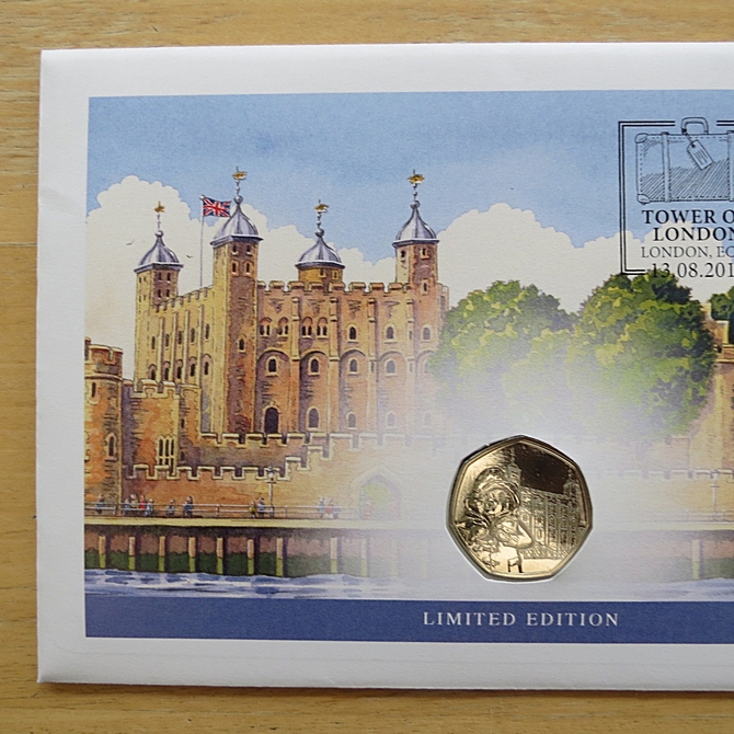 This 2019 Paddington at the Tower of London 50p pence coin cover is a first day cover by Westminster. It celebrates Paddington a renowned children's character visiting the Tower of London and hosts a brilliant uncirculated 50p pence coin by the Royal Mint and a Royal Mail stamp featuring Paddington in a red hat holding marmalade. Cancelled postmark Tower of London EC3N 13th August 2019.