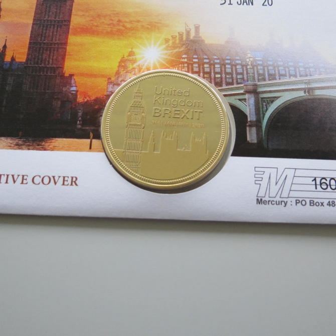 This 2020 Brexit commemorative medal cover is issued in UK as PNC First Day Covers. It hosts a 24 carat gold plated medal marking the date United Kingdom exiting the European Union and a Royal Mail stamp. Comes presented on a card complete with a certification of authenticity. Postmark cancelled dated 31st January 2020.