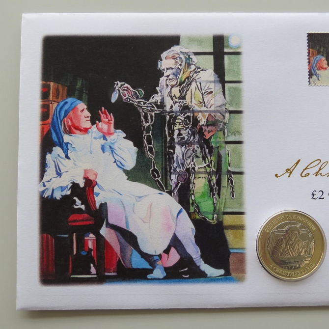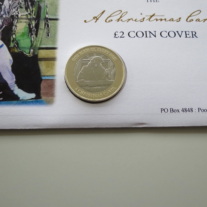 This 2021 Charles Dickens A Christmas Carol 2 pounds coin cover is issued in UK as PNC First Day Covers. It hosts a brilliant uncirculated two pounds coin by the Royal Mint and a Royal Mail stamp. Cancelled postmark 7th February 2021, Charles Dicken's birth anniversary date.