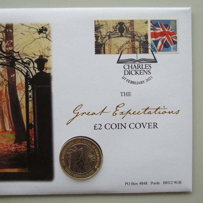 This 2021 Charles Dickens Great Expectations 2 pounds coin cover is issued in UK as PNC First Day Covers. It hosts a brilliant uncirculated two pounds coin and a Royal Mail stamp. Cancelled postmark dated, 7th February 2021, Charles Dicken's birth annivarsary.