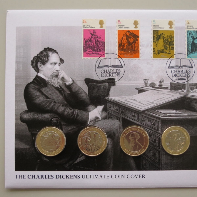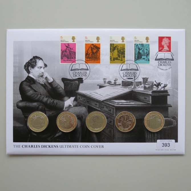 This 2021 Charles Dickens ultimate 2 pounds coin cover is issued in UK as PNC First Day Covers. It hosts 5 brilliant uncirculated two pounds coins by Jersey and Royal Mail stamps. Comes presented in a folder complete with a certification of authenticity. Postmark cancelled dated 7th Frbruary 2021. Limited issue of 495.