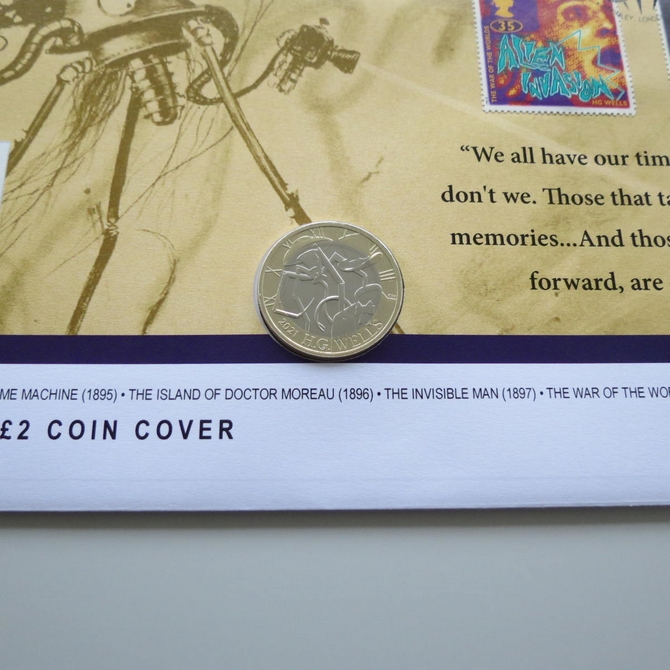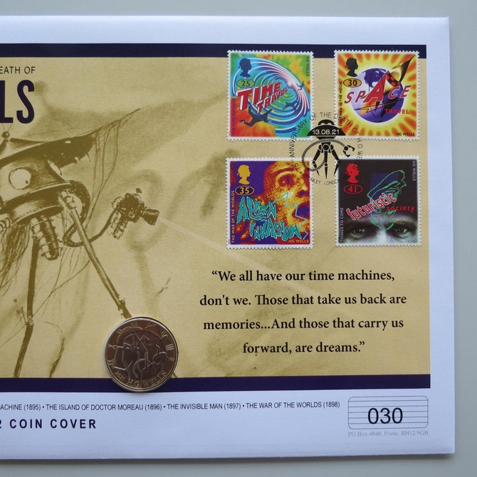 This 2021 HG Wells 75th anniversary of death 2 pounds coin cover is issued in UK as PNC First Day Covers. It hosts a brilliant uncirculated two pounds coin by the Royal Mint and Royal Mail stamps. Comes presented on a card complete with a certification of authenticity. Postmark cancelled dated 13th August 2021. Limited issue of 495.