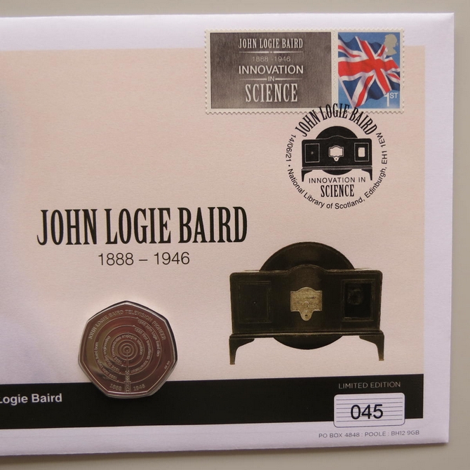 This 2021 John Logie Baird Innovation In Science 50p coin cover is issued in UK as PNC First Day Covers. It hosts a brilliant uncirculated fifty pence coin by the Royal Mint and a Royal Mail stamp. Comes presented on a card complete with a certification of authenticity. Postmark cancelled dated 14th June 2021. Limited issue of 495.