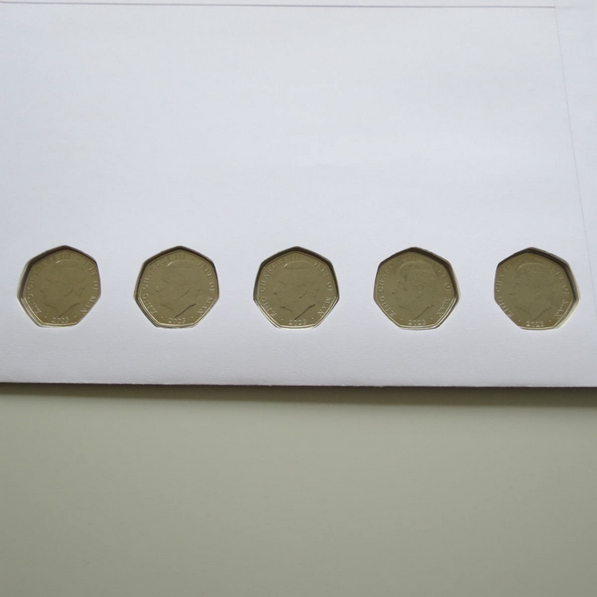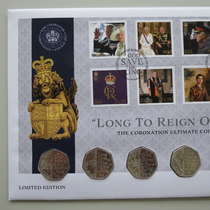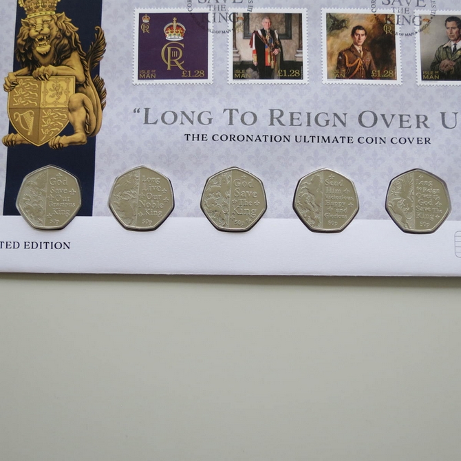 This 2023 Coronation of King Charles III ultimate 50p pence coin cover is issued in UK as PNC First Day Covers. It hosts 5 brilliant uncirculated Isle of Man fifty pence coins and Royal Mail stamps. Comes presented on a card complete with a certification of authenticity. Postmark cancelled dated 6th May 2023. Limited issue of 495.