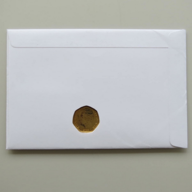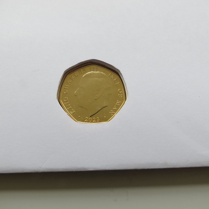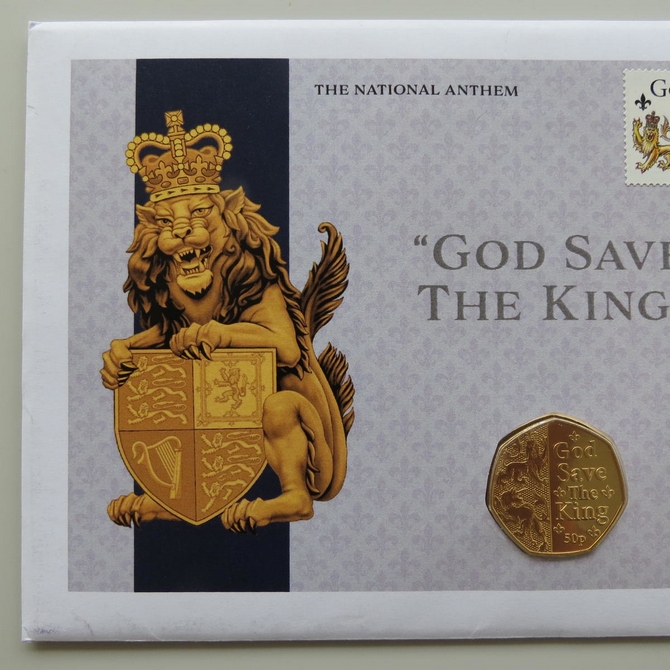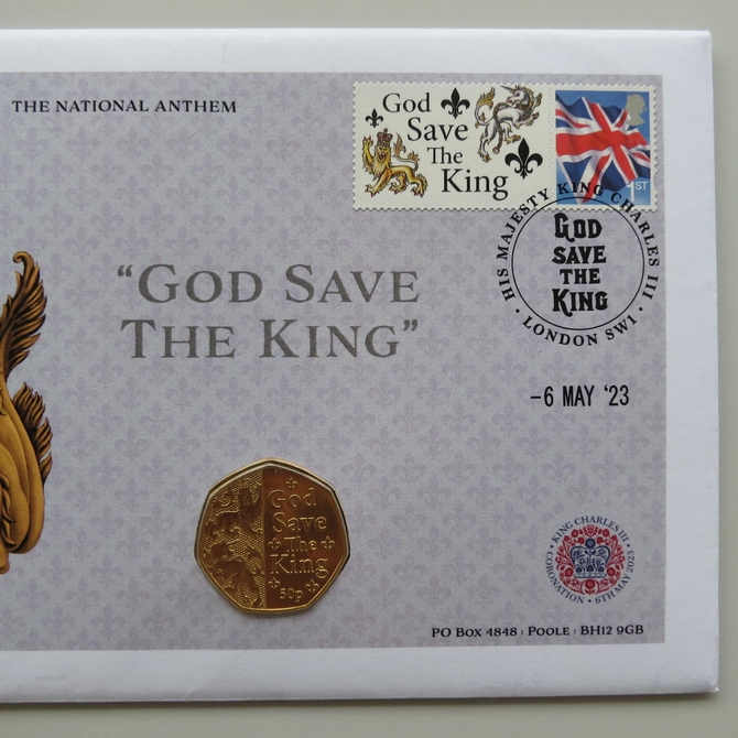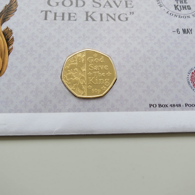 This 2023 King Charles III Coronation 50p pence first day coin cover named God Save the King issued in the UK as PNC covers. It hosts a 24ct gold-plated brilliant uncirculated fifty pence coin and a Royal Mail stamp. Cancelled postmark 6th May 2023.