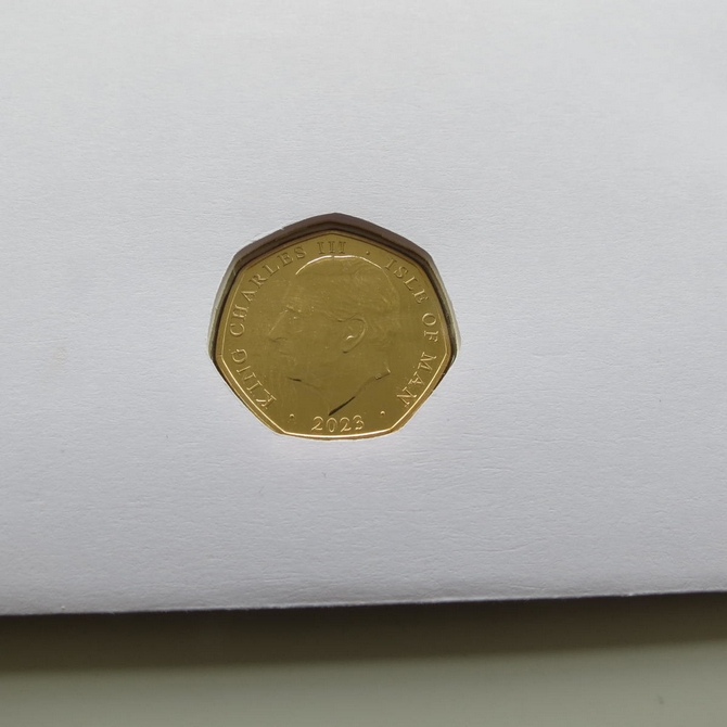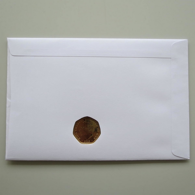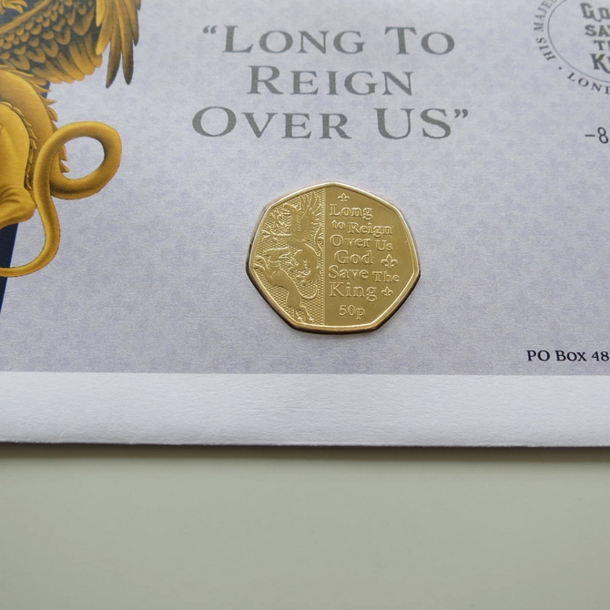 This 2023 King Charles III Coronation 50p pence first day coin cover named Long To Reign Over Us issued in the UK as PNC covers. It hosts a 24ct gold-plated brilliant uncirculated fifty pence coin and a Royal Mail stamp. Cancelled postmark 8th September 2023.