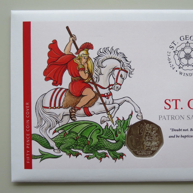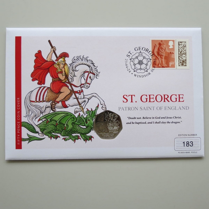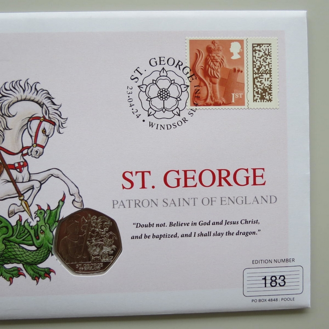 This 2024 St George Patron Saint of England 50p pence coin cover is issued in UK as PNC First Day Covers. It hosts a brillinat uncirculated fifty pence coin by Jersey and a royal Mail stamp. Comes presented on a card complete with a certification of authenticity. Postmark cancelled dated 23rd April 2024. Limited issue of 500.