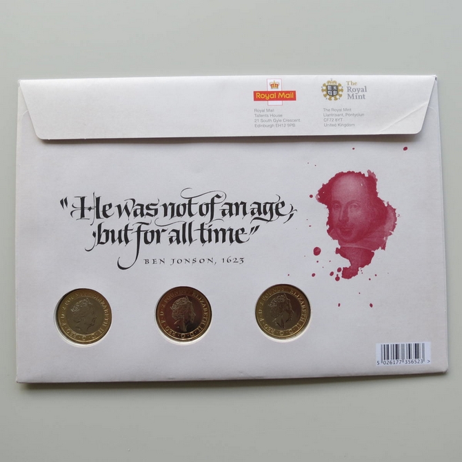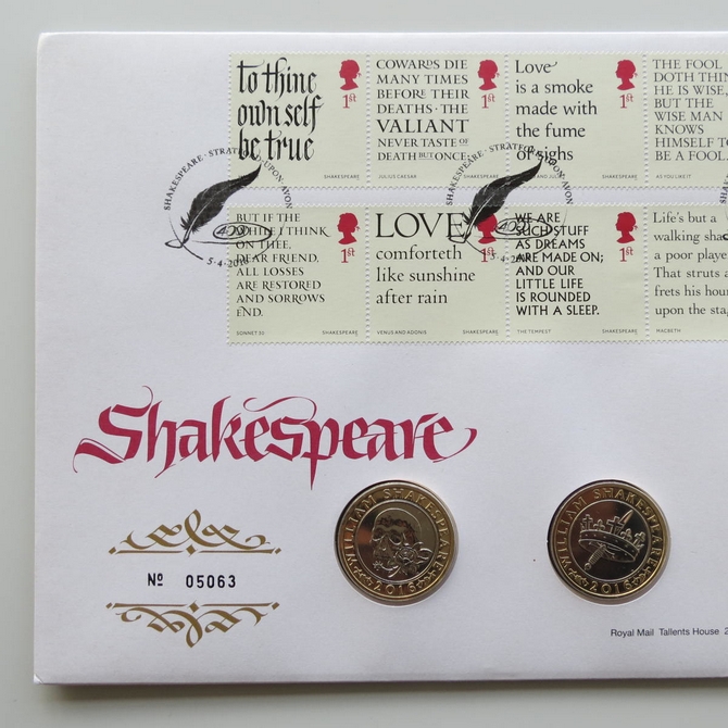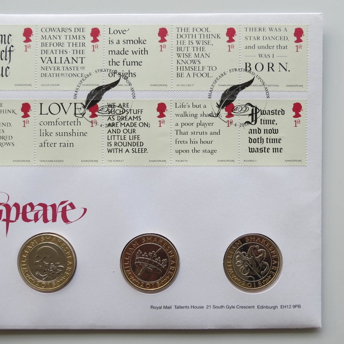 This 2016 Shakespeare 400th anniversary 3x 2 pounds coin cover is a Royal Mail first day cover. It commemorates the 400 years death anniversary of William Shakespeare and hosts 3 brilliant uncirculated two pounds coins by the Royal Mint and Royal Mail stamps. Each coin depicts Shakespeare's works in Tragedies, Histories and Comedies and the stamps reflect excerpts from his different writings. Cancelled postmark Shakespeare Stratford Upon Avon 5th April 2016.
