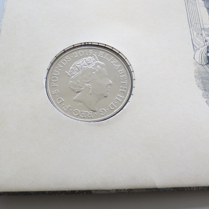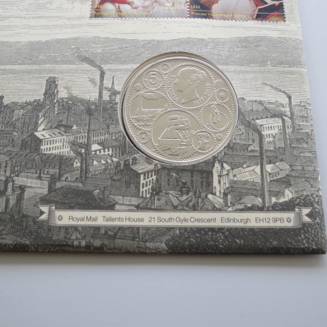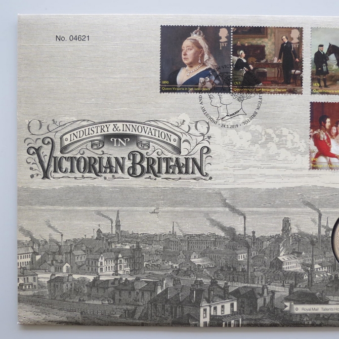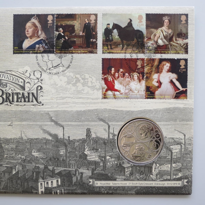 This 2019 Victorian Britain Industry & Innovation 5 pounds coin cover is a Royal Mail first day cover. It celebrates the innovations and industry in Victorian Britain and hosts a brilliant uncirculated five pounds coin by the Royal Mint and Royal Mail commemorative stamps. The coin depicts the Victorian inventions and the stamps show illustrations of Queen Victoria. Cancelled postmark Industry & Innovation in Victorian Britain Clifton Bristol 24th May 2019.