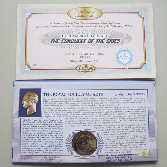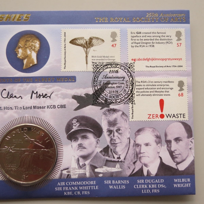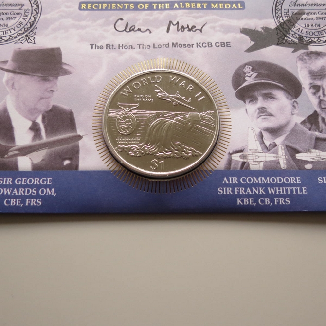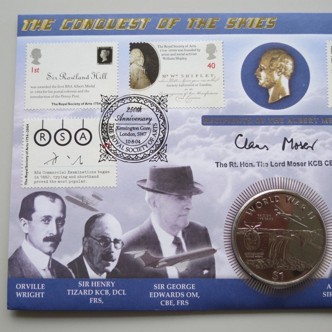 This 2004 Royal Society of Arts 250th anniversary 1 Dollar coin cover is a Benham first day cover. It celebrates the 250 years of the RSA and hosts a brilliant uncirculated one dollar coin. Cover title The Conquest of the Skies commemorating the Dambusters attack on the dams of the Ruhr during WWII. Signed cover by Rt.Hon. The Lord Moser KCB CBE. Cancelled postmark 250th Anniversary The Royal Society of Arts Kensington Gore London SW7 10th August 2004.