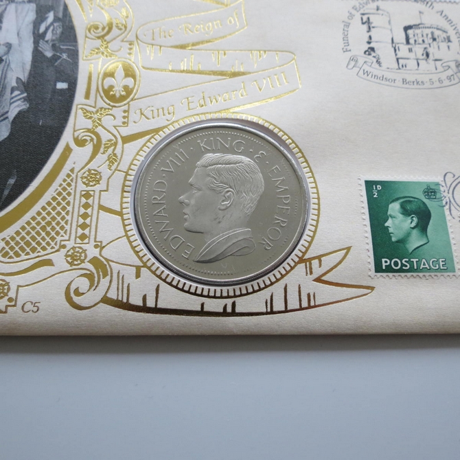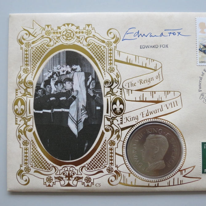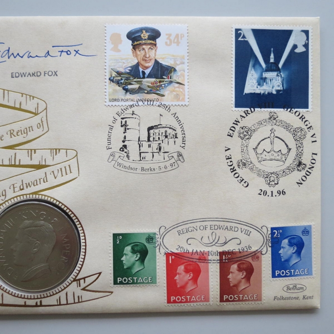 This 1997 The Reign of King Edward VIII 25th anniversary crown coin cover is a Benham first day cover. It commemorates 25 years of King Edward VIII's death and hosts a one crown coin and Royal Mail stamps showing the portrait and short reign of the King. FDC hand signed by Edward Fox, a British actor. Cancelled postmark Funeral of Edward VIII 25th Anniversary Windsor Berks 5th June 1997.