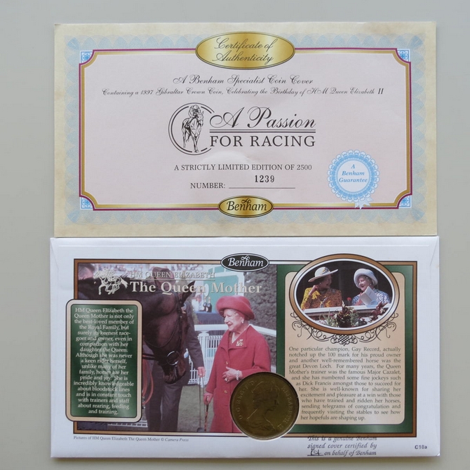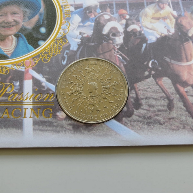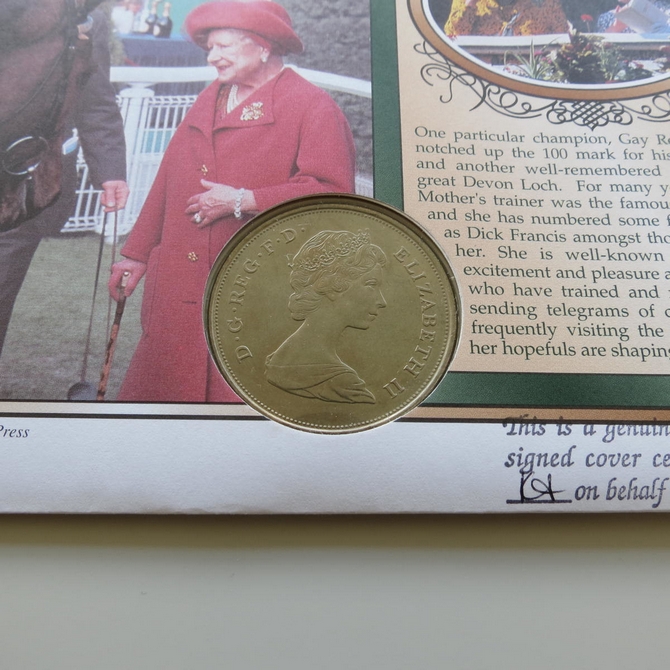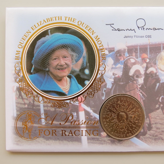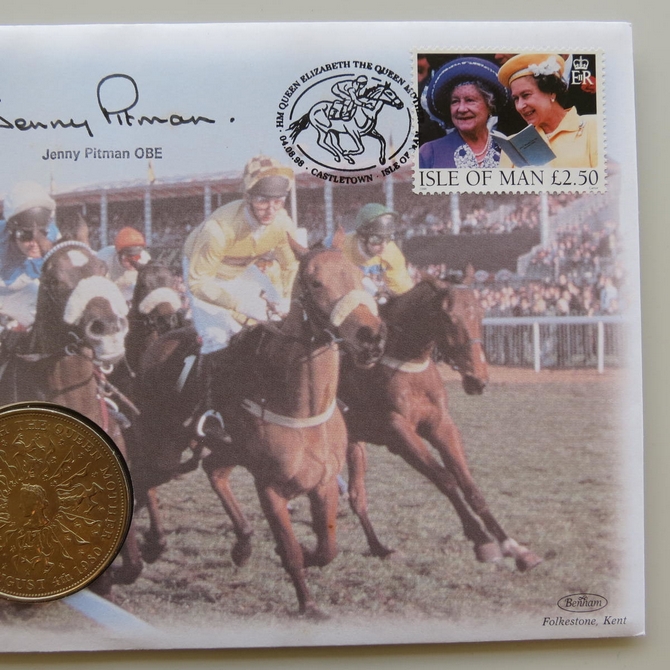 This 1998 Queen Elizabeth Passion For Horse Racing crown coin cover is a Benham first day cover. It celebrates the Queen Mother's interest of horse racing and hosts a brilliant uncirculated one crown coin and a Isle of Man stamp. FDC hand signed by Jenny Pitman. Cancelled postmark HM Queen Elizabeth The Queen Mother Castletown Isle of Man 4th August 1998.
