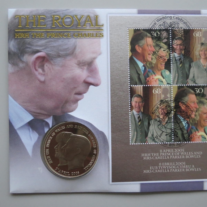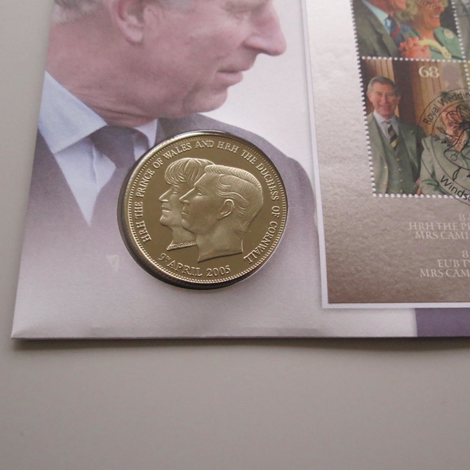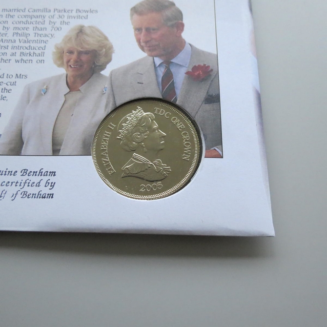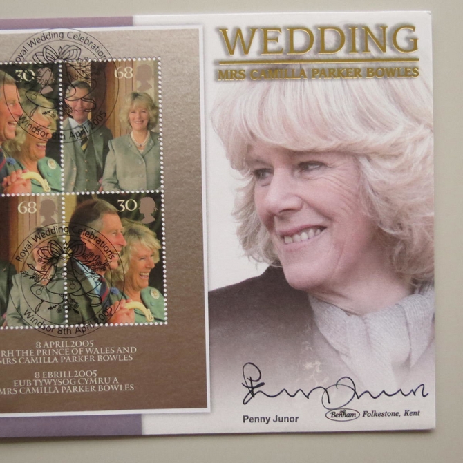 This 2005 Prince of Wales Royal Wedding 1 crown coin cover is a Benham first day cover. It celebrates the Royal wedding of HRH Prince Charles, Prince of Wales and hosts a brilliant uncirculated Tristan Da Cunha one crown coin and Royal Mail stamps showing Prince Charles and Mrs Camilla Parker Bowles during the Royal Wedding celebrations. FDC hand signed by Penny Junor, an English journalist. Cancelled postmark Royal Wedding Celebrations Windsor 8th April 2005.