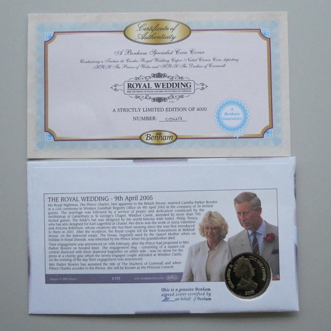 2005 Prince of Wales Royal Wedding 1 Crown Coin Cover - Benham First Day Cover - Signed