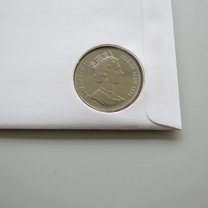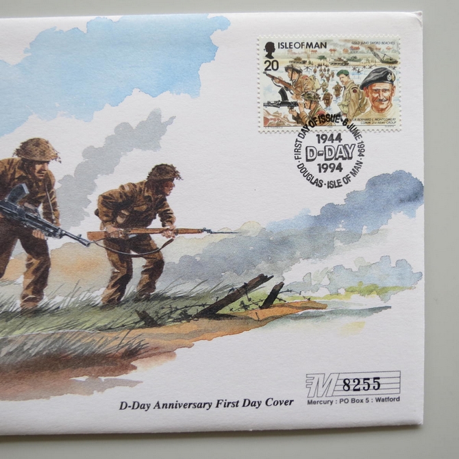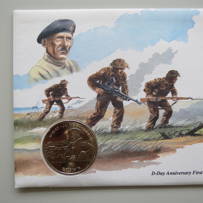 This 1994 D-Day Landings 50th anniversary crown coin cover is a Isle of Man first day cover. It commemorates D-Day landings 50th anniversary featuring Bernard Montgomery and hosting a brilliant uncirculated one crown coin and a Isle of Man stamp showing a portrait of General Sir Bernard L Montgomery. Cancelled postmark D-Day 1944 1994 First Day of Issue Douglas Isle of Man 6th June 1994.