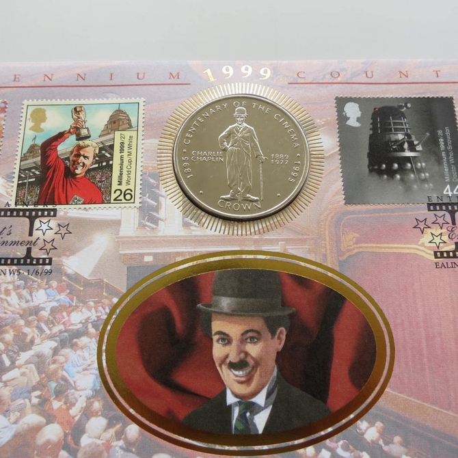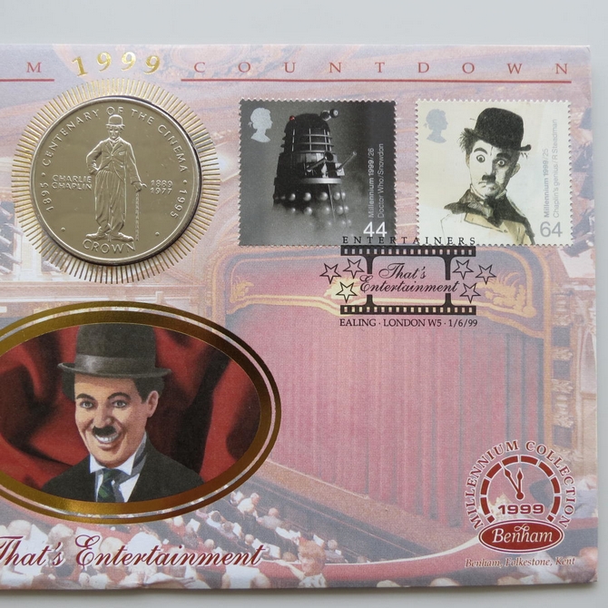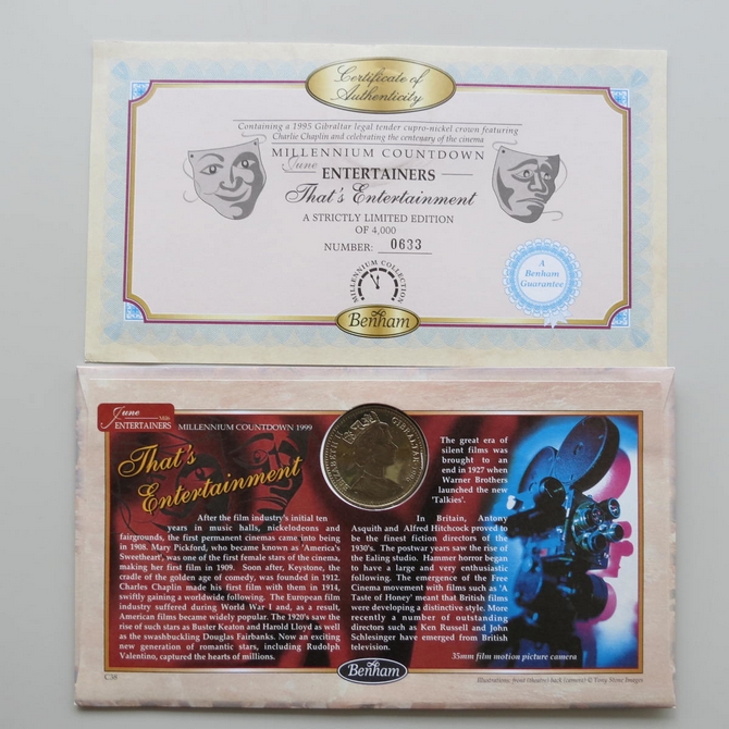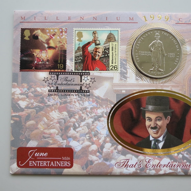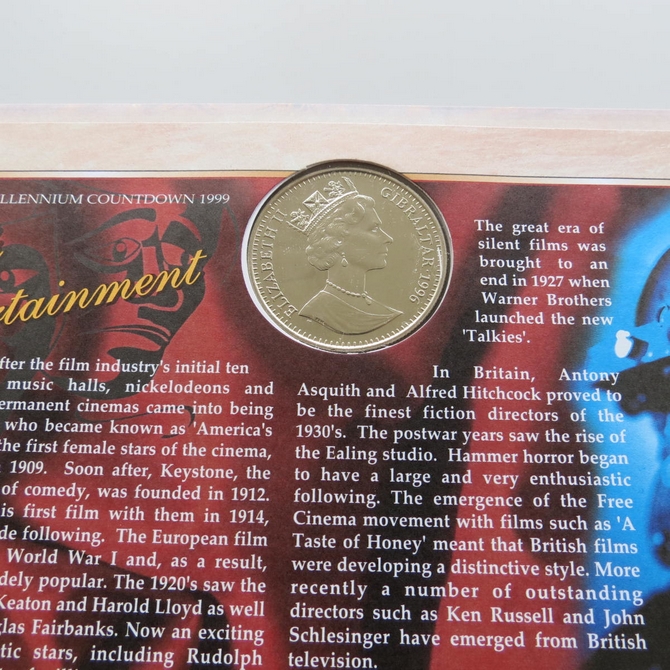 This 1999 Millennium Countdown Entertainers Gibraltar 1 crown coin cover is a Benham first day cover. It's named That's Entertainment and hosts a brilliant uncirculated Gibraltar one crown coin and Royal Mail commemorative stamps dedicated to the theme of sports and entertainment. Cancelled postmark That's Entertainment Ealing London W5 1st June 1999.