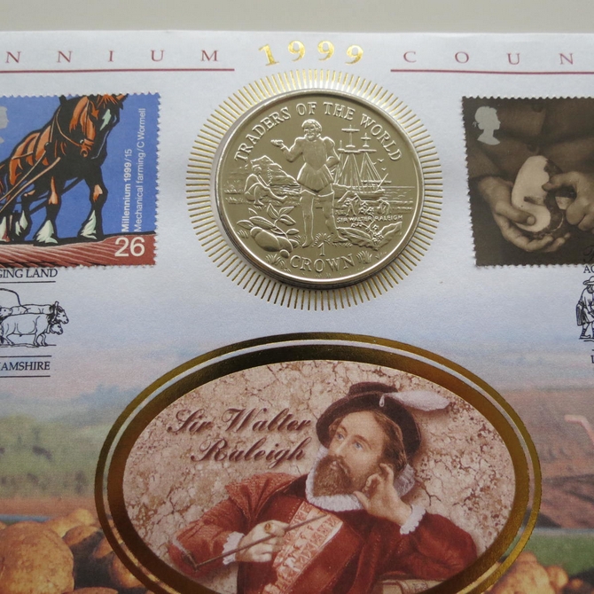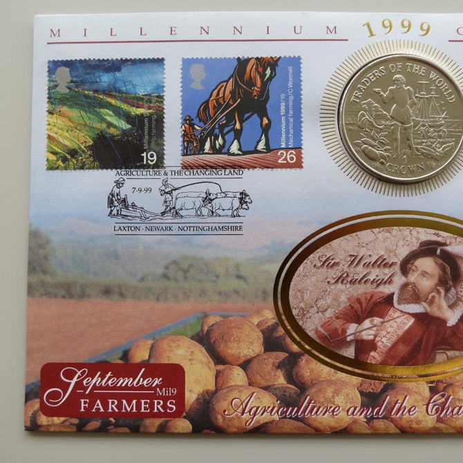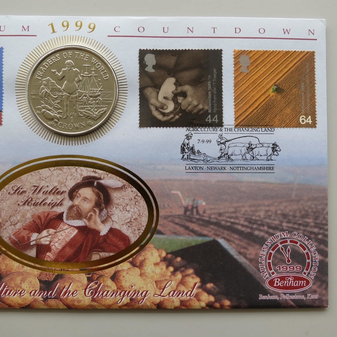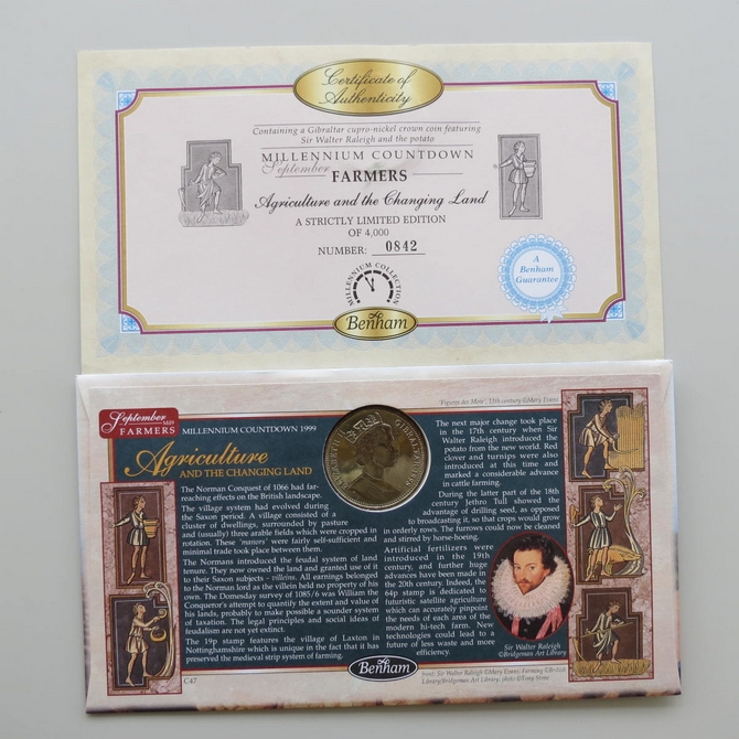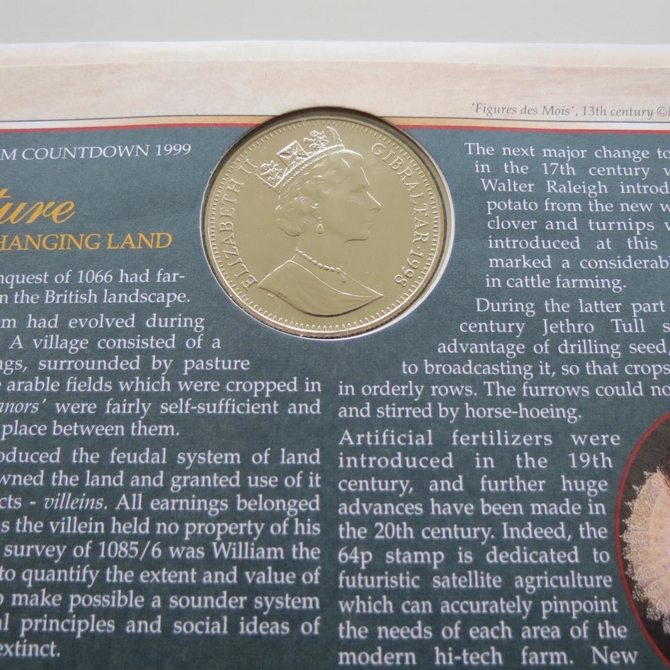This 1999 Millennium Countdown Farmers Gibraltar 1 crown coin cover is a Benham first day cover. It's named Agriculture and the Changing Land and hosts a brilliant uncirculated Gibraltar one crown coin and Royal Mail commemorative stamps dedicated to the theme of land and farming. Cancelled postmark Agriculture & the changing land Laxton Newark Nottinghamshire 7th September 1999.