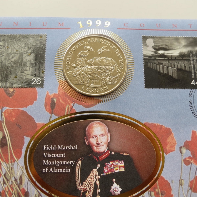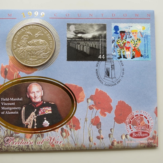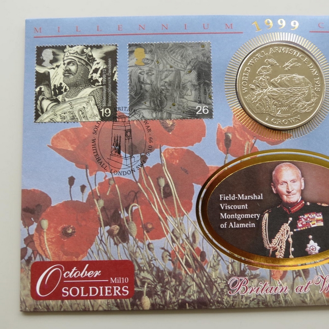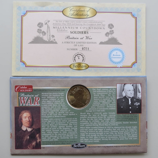 This 1999 Millennium Countdown Soldiers Isle of Man 1 crown coin cover is a Benham first day cover. It's named Britain at War and hosts a brilliant uncirculated Isle of Man one crown coin and Royal Mail commemorative stamps dedicated to the theme of war and peace. Cancelled postmark Soldiers Britain at War Whitehall London SW1 5th October 1999.