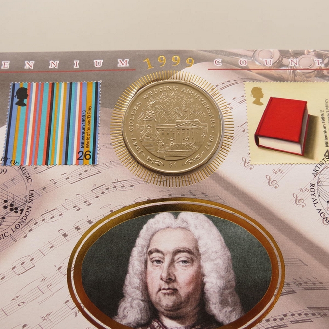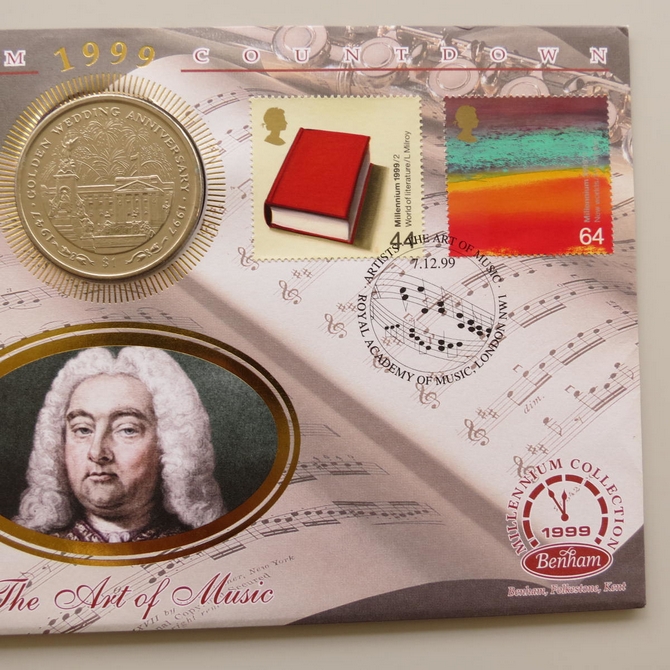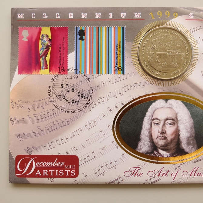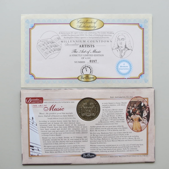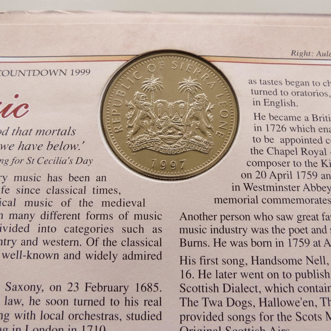 This 1999 Millennium Countdown Artists 1 dollar coin cover is a Benham first day cover. It's named The Art of Music and hosts a brilliant uncirculated Sierra Leone one dollar coin and Royal Mail commemorative stamps dedicated to the theme of music, stage and literature. Cancelled postmark Artists The Art of Music Royal Academy of Music London NW1 7th December 1999.