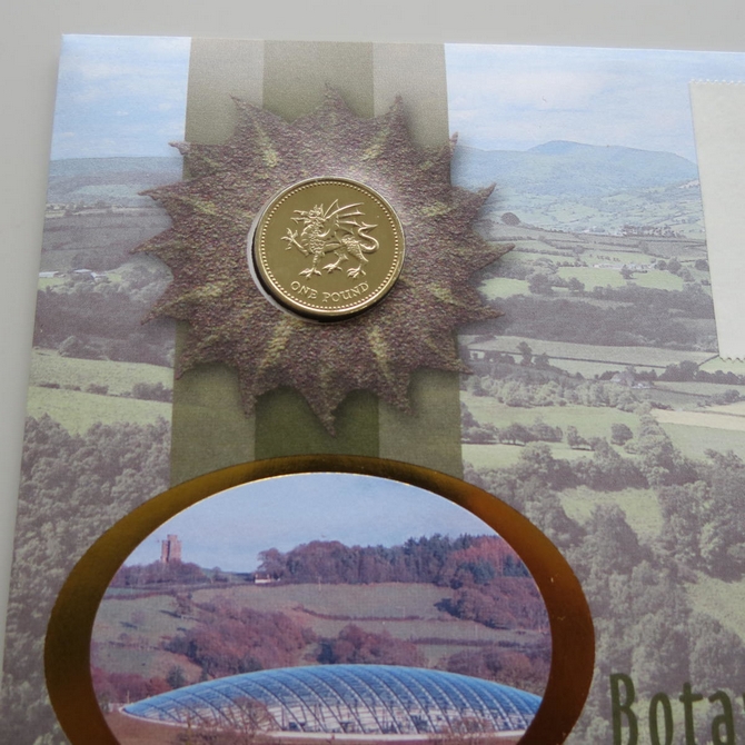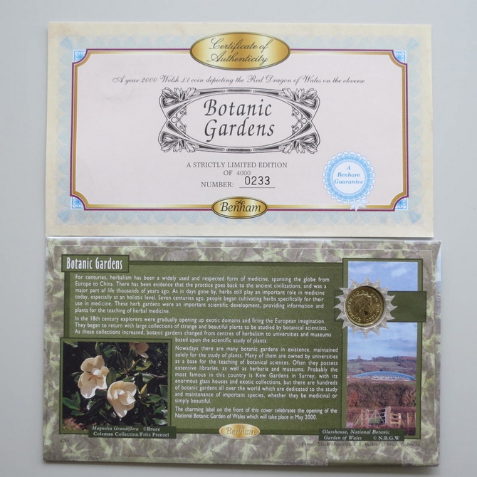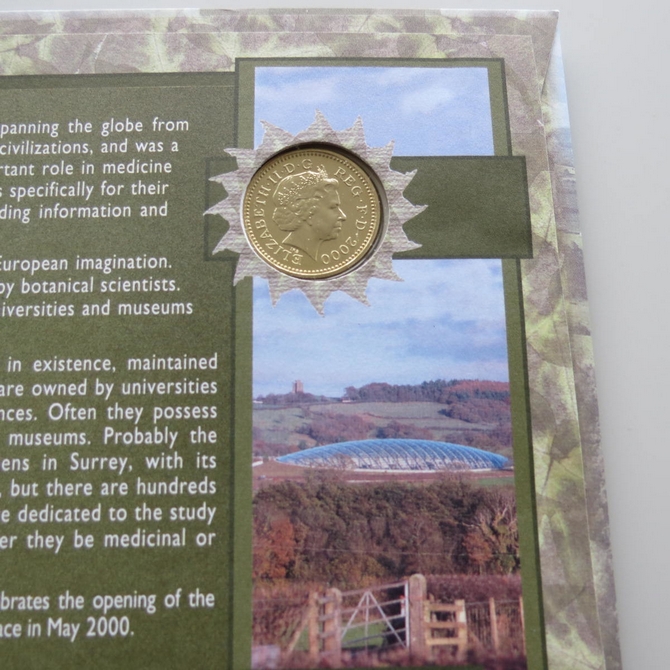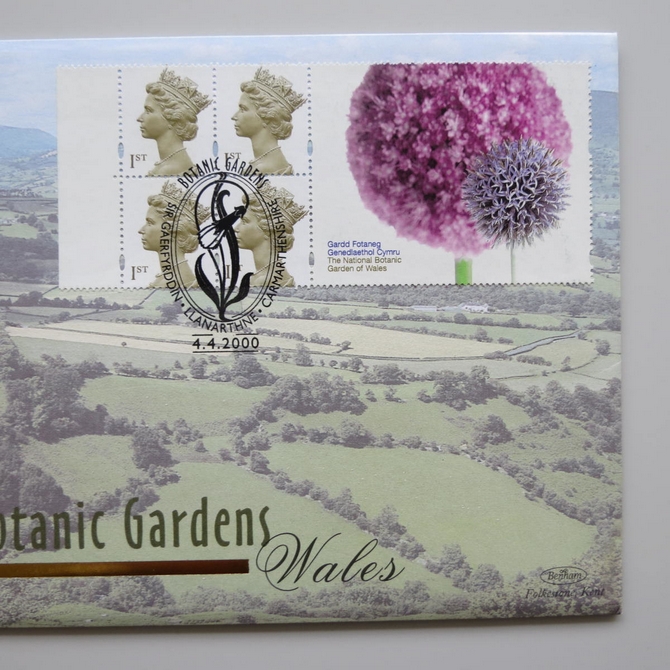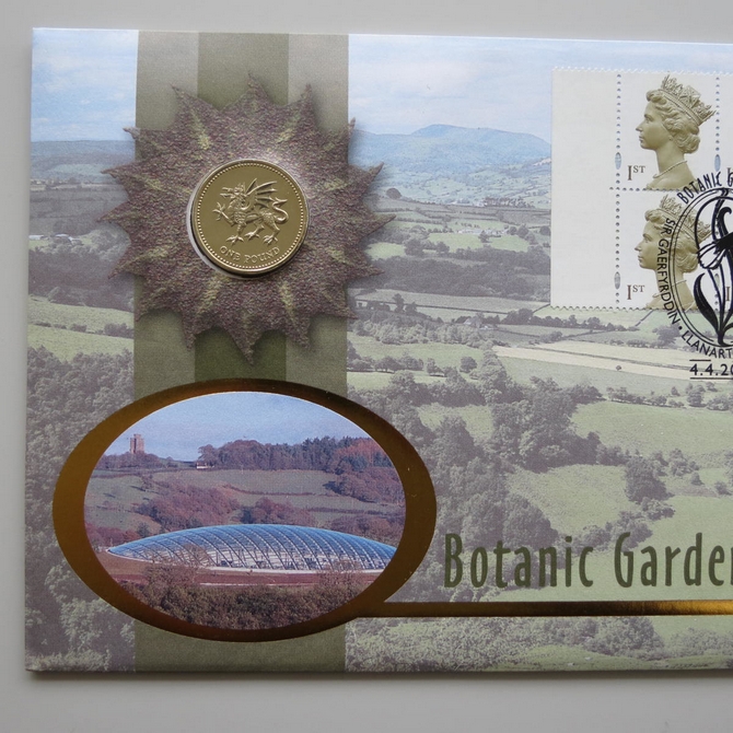 This 2000 Botanic Gardens Wales 1 pound coin cover is a Benham first day cover. It celebrates the National Botanic Garden of Wales and hosts a brilliant uncirculated one pound coin by the Royal Mint and Royal Mail commemorative stamps showing a flower. Cancelled postmark Botanic Gardens Sir Gaerfyrddin Llanarthne Carmanthenshire 4th April 2000.