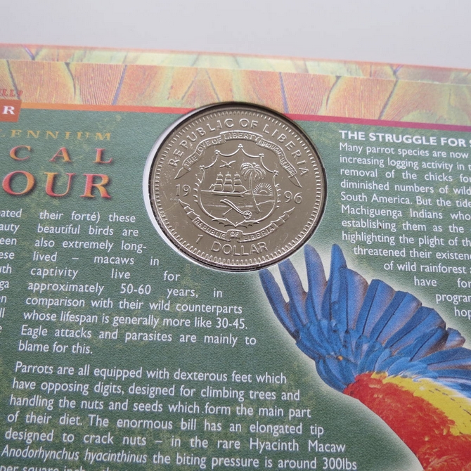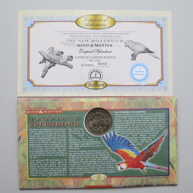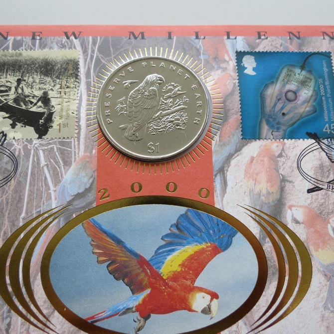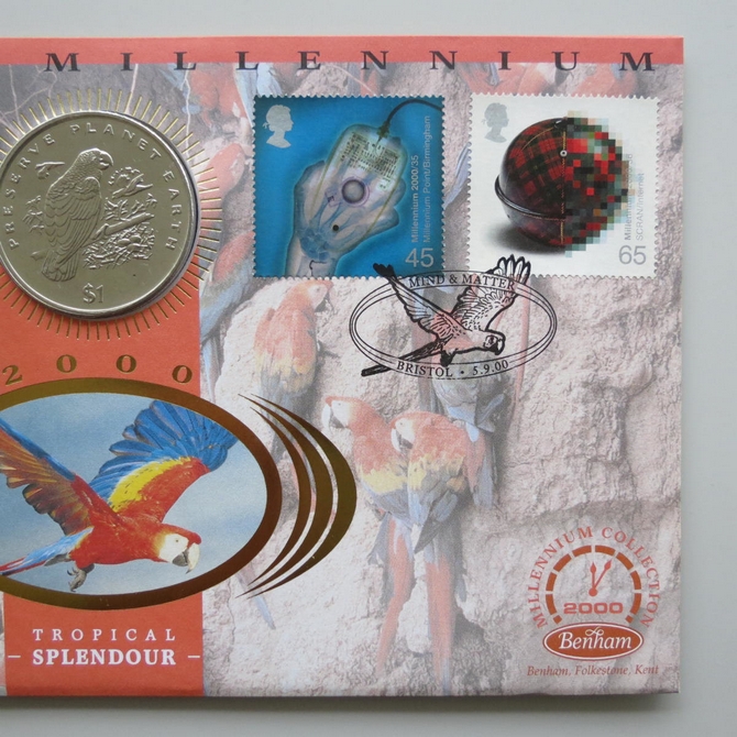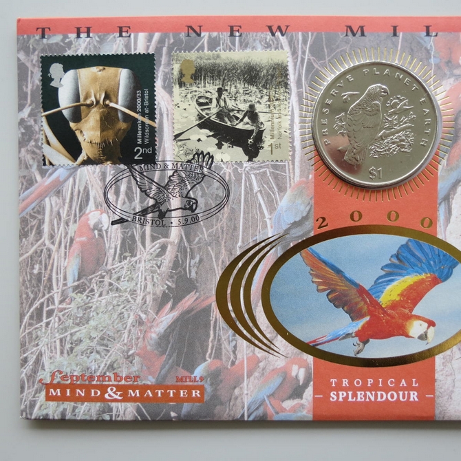 This 2000 The New Millennium Mind & Matter 1 dollar coin cover is a Benham first day cover. The new millennium cover is named Tropical Splendour and hosts a brilliant uncirculated one dollar coin and Royal Mail commemorative stamps. Cancelled postmark Mind & Matter Bristol 5th September 2000.